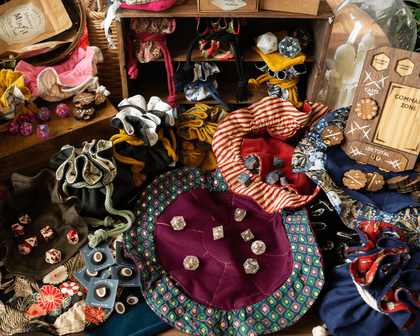 I have a friend who makes custom dice, his wife hand makes dice bags, and they are so lovely. They are in the Netherlands and have an etsy. Can’t go wrong with a pretty d20 in a lovely bag! I’d collect every pretty dice in the world, despite never getting the chance to use them. Find their Etsy store, Nether and Fable, here.