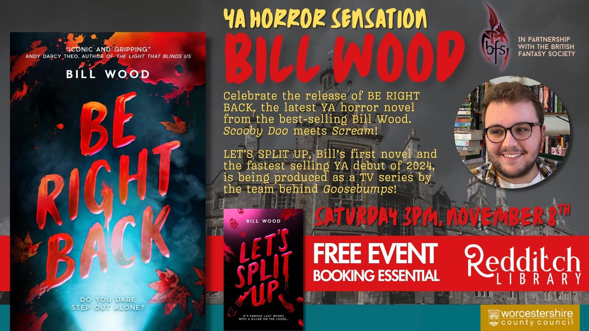 Scooby Doo meets Scream in Bill Wood’s best-selling teen slasher novels Let’s Split Up and Be Right Back. Bill Wood is a bestselling author, writing mysteries for young adult and adult audiences. His debut novel, Let’s Split Up was an instant top 10 bestseller and the fastest selling YA debut of 2024 in the UK. It has been optioned to be turned into a television series by the team behind Goosebumps. Be Right Back, the best-selling follow-up, was released in October 2025.