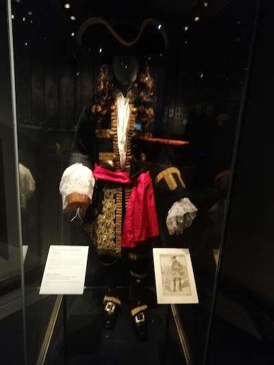 We are now invited to learn more about real pirates. There are displays on the likes of Captain William Kidd (c1645-1701), Edward Teach AKA Blackbeard (c1680-1718), and the female pirates Anne Bonny (1698-1782) and Mary Read (c1695-1721). The “Golden Age of Piracy”, if one dares call it that, lasted from about 1680 to 1722 and these were some of the major players. Pirate life on board ship was not all drinking and carousing—rising at sunrise, eating a biscuit and a strip of preserved meat and having a host of jobs to complete. Boozing and gambling were often outlawed on ship; discipline and obedience being key to success, as in any criminal gang.