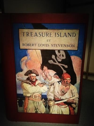 There’s also a well-weathered 17th Century pistol in iron, brass and wood of the sort Jim used to defend himself against the murderous Israel Hands, along with a lovely diorama of the ship Hispaniola lying off the coast of Treasure Island.