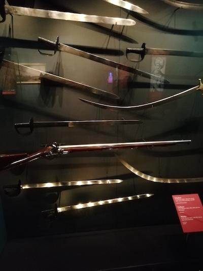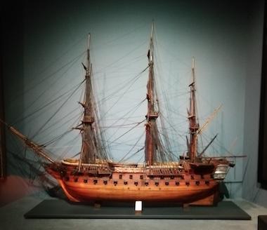 What we do quite consciously note, however, is that the British fleets have been present and prevalent in many waters way beyond our shores over the centuries. For example, there is a big display on the Bombardment of Algiers in 1816, led by Admiral Lord Exmouth and the British and Dutch fleet which put an end to raids on European shipping and the enslavement of Christians by shelling the port city of Algiers from the sea and killing between one and three thousand people. Quite movingly, the woollen Ottoman flag—red with three white crescents—is on display as a war trophy taken in the battle by Royal Navy lieutenant James Everard.