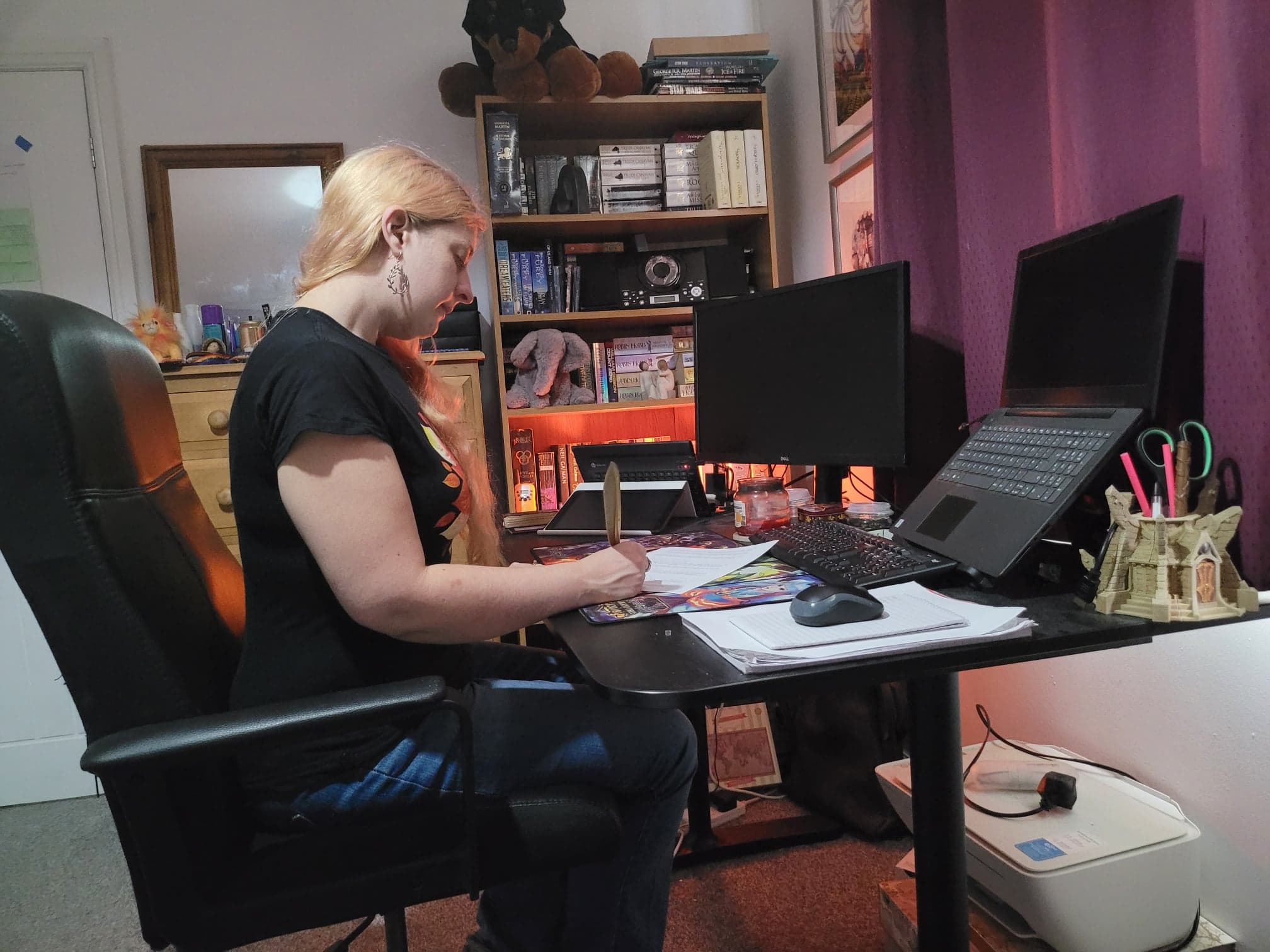 A bit of both. I’ve sent up a nice office space in the corner of my bedroom. It has one of my bookcases behind me with a lot of great fantasy books—largely so I have a pretty background for social media and online events. My desk points towards the window so I can see some trees. There’s occasionally blue sky, but this is Manchester so let’s not get carried away.