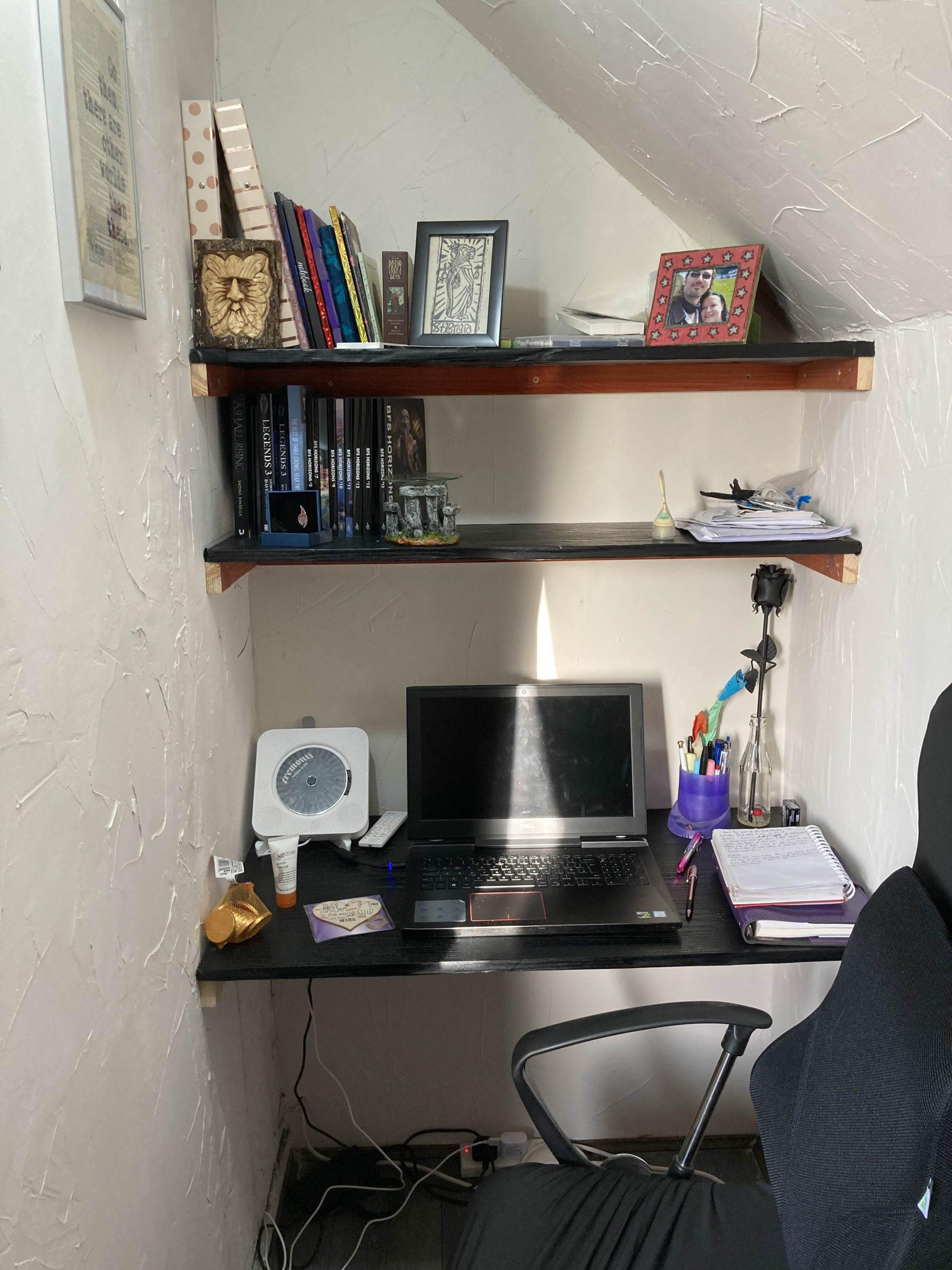 There was a walk-in cupboard off my bedroom that I had converted into an office for me to work in. It’s tiny, and it’s in the eaves of the house so it’s very chilly in the winter, but I love it more than I can say.