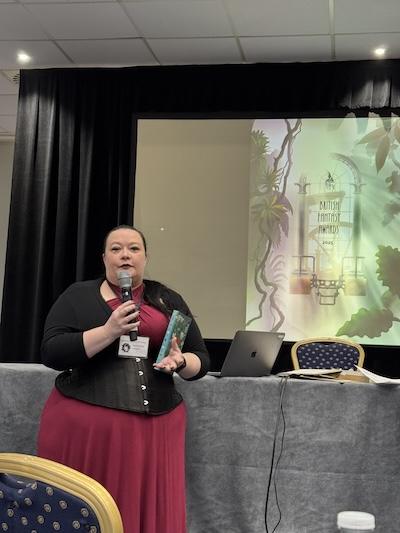 (Pictured: Shona at this year’s British Fantasy Awards, presenting the KEW Award at World Fantasycon, Brighton.)
