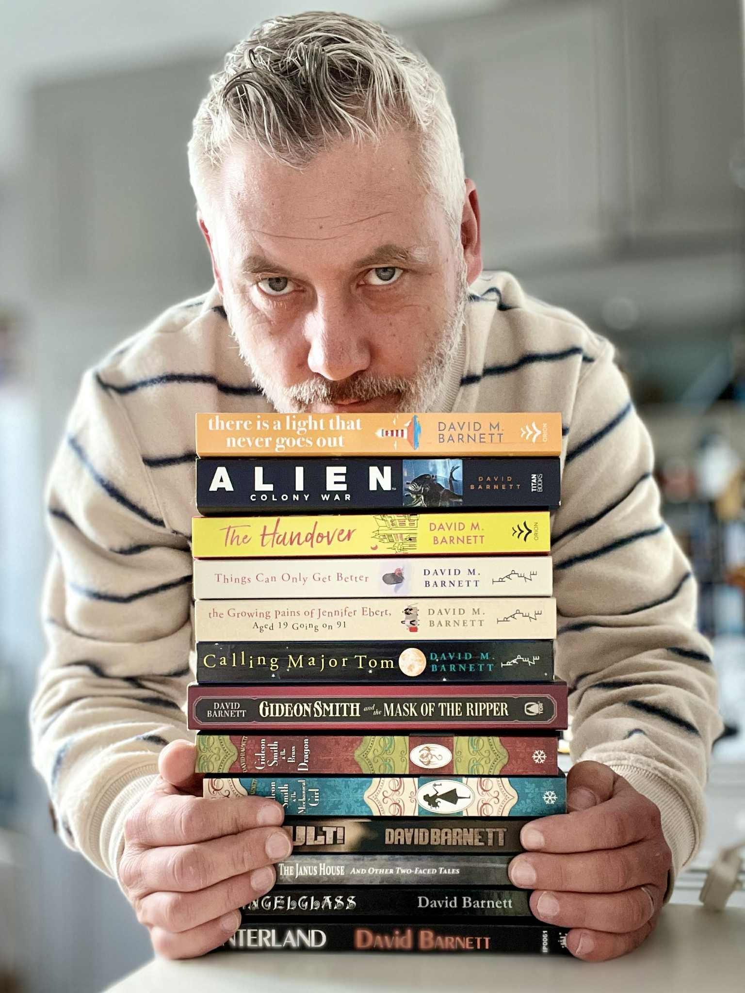 (Pictured: David with his many and varied novels)