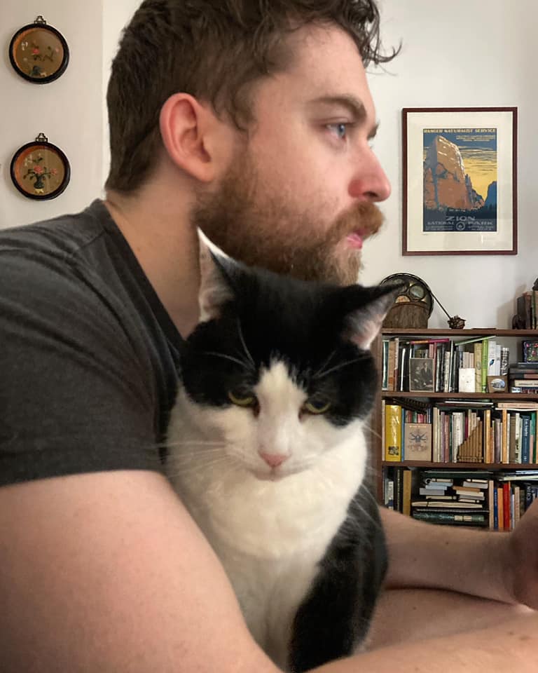 (Pictured: Eric’s partner Brian with their cat McNulty, named after Dominic West’s character in The Wire—and the inspiration for Miaow from the Guardians of the New Moon books)