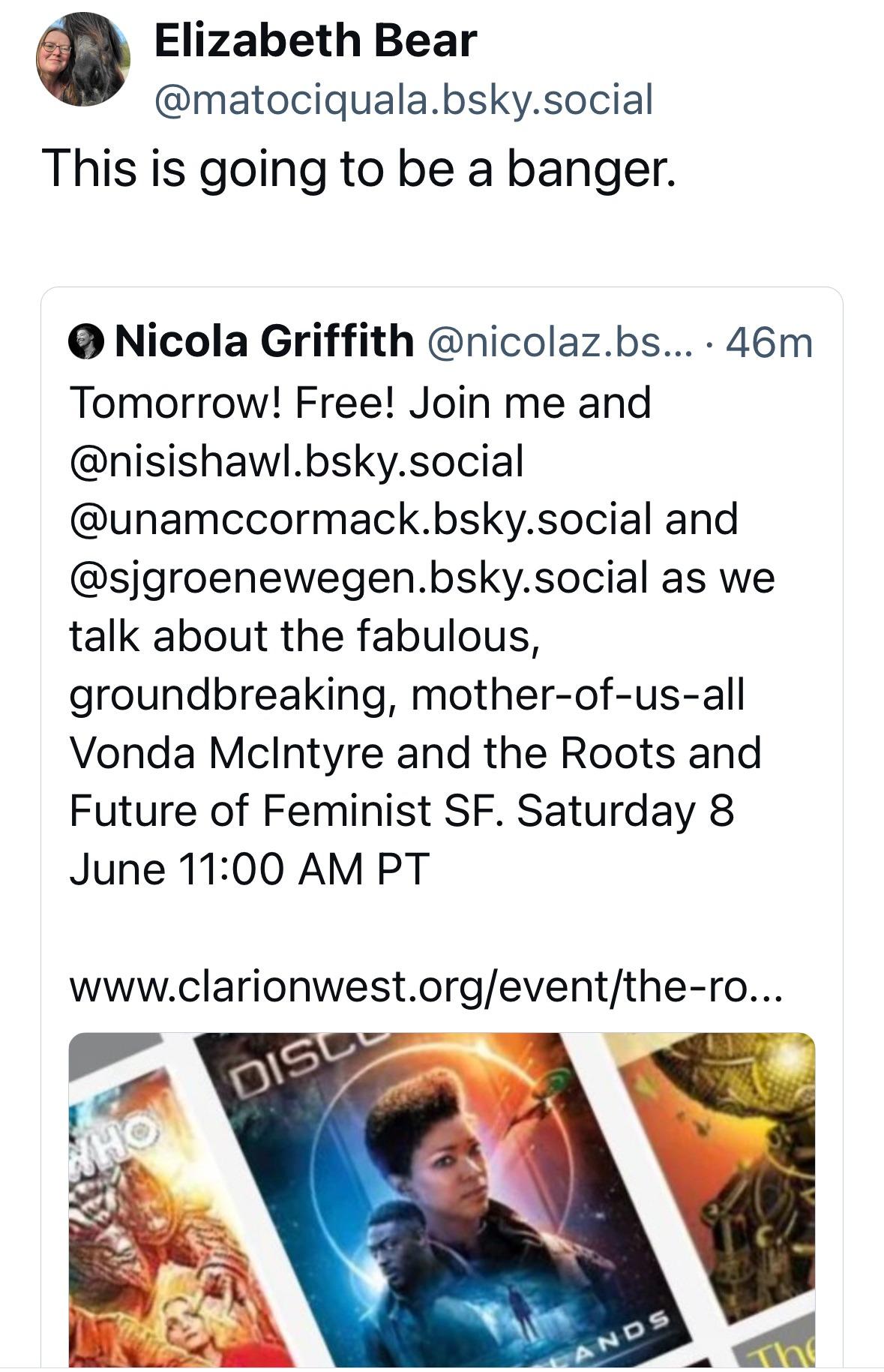 (Pictured: A screen-grab about an online talk SJ did with Nicola Griffith, Nisi Shawl and Una McCormack about Vonda McIntyre for Clarion West.)