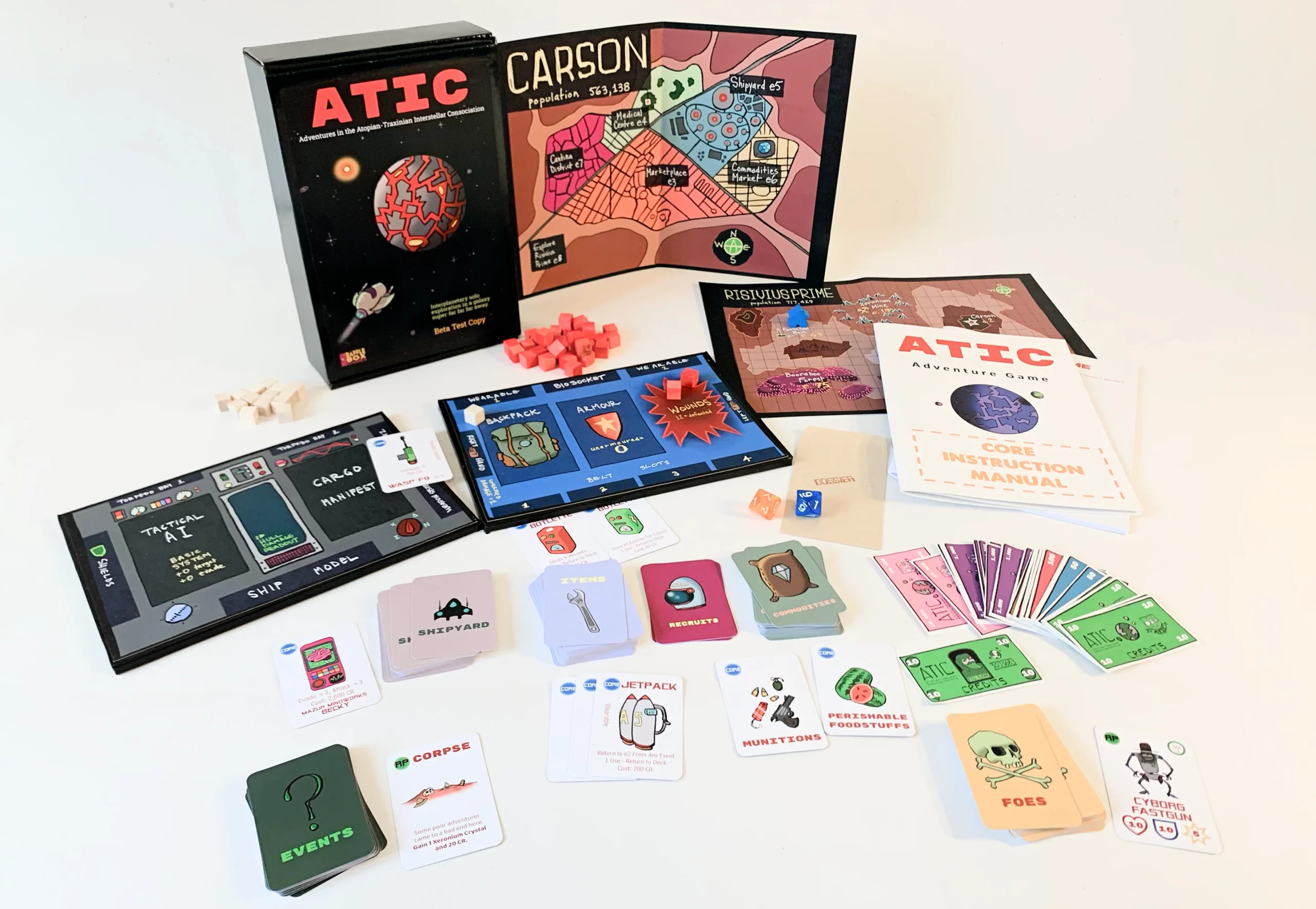 ATIC is a cooperative / solo adventure board game set in the galaxy of the Atopian-Traxinian Interstellar Consociation. With your very own spaceship, puzzles, fights and surprises, join us to explore our first planet: Atopia!