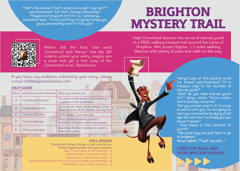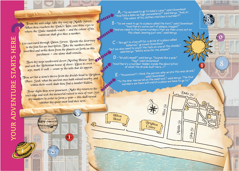 We travelled to Brighton and took a great many photos. There’s the danger that clues might be moved or covered up, so we were looking for things in the environment that would still be there when the convention was on. And then we had to create a mystery that navigated a looping route that began and ended at the convention hotel.