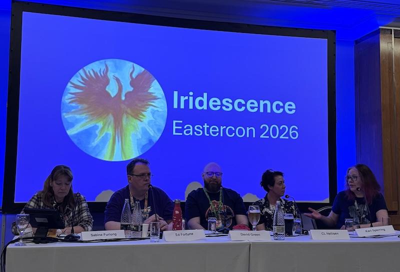 David, centre, with fellow panelists Sabine Furlong, Ed Fortune, CL Hellison and Kari Sperring on the Supernatural panel at Eastercon 2026